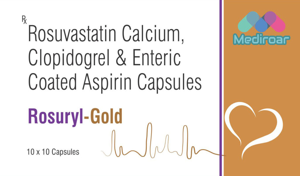 Rosuryl-Gold Leave a Comment / Products / By Admin ROSURYL GOLD 10Rosuvastatin Calcium 10mg, Clopidogrel 10mg, Enteric Coated Aspirin 75mg Capsules.